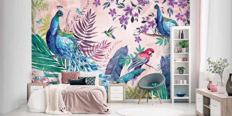 purple and blue tropical peacock wallpaper mural called Tropical Peacock by Di Brookes for bedrooms and living rooms