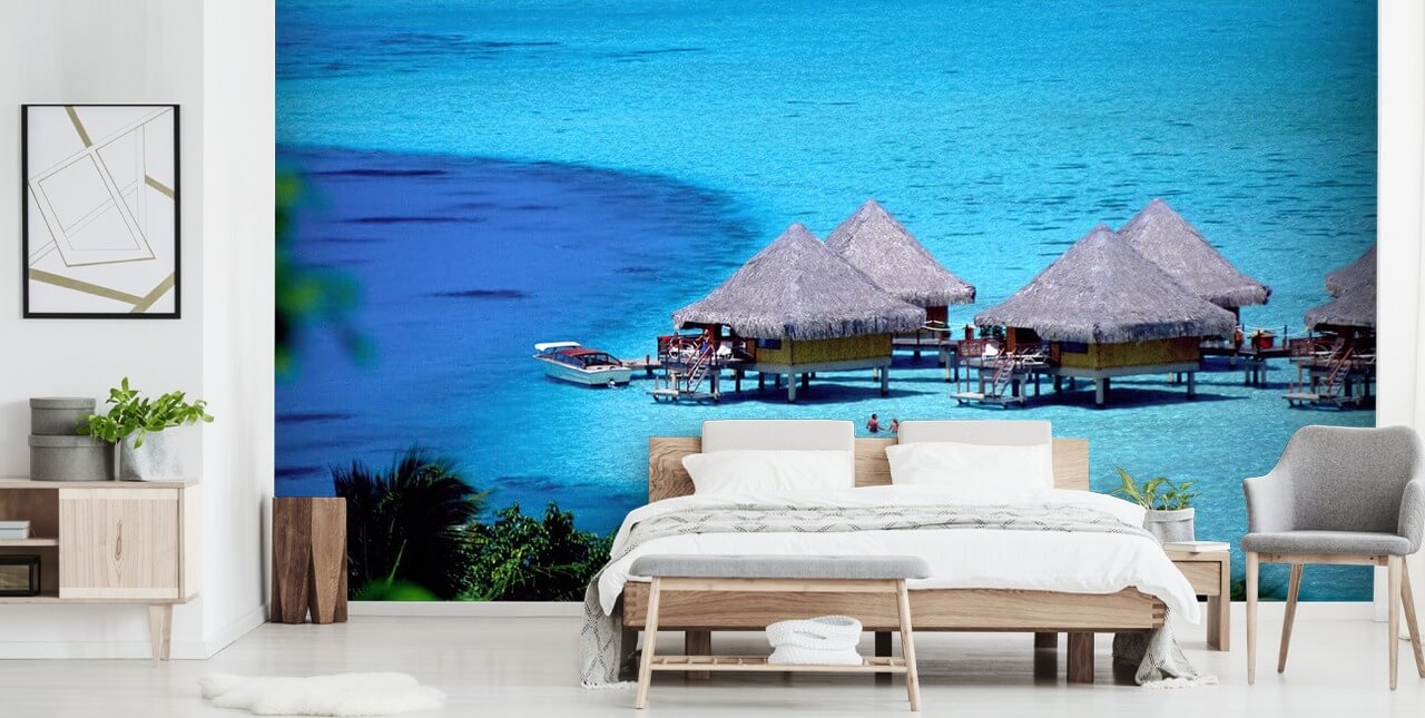 Transform your home with this gorgeous Bora Bora wallpaper. We adore the different blue tones of the waters in this tropical beach wallpaper and think that they could be used in a range of different ways in the room's design: paint the walls in a shade of pastel blue and have navy blue scatter cushions.