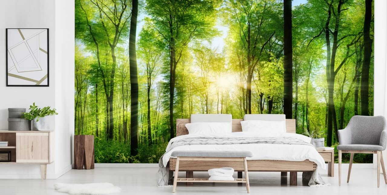 Forest Panoramic with Sunbeams - Green Woodland Wallpaper