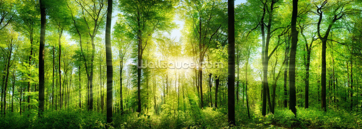Stunning Forest Panoramic with Sunbeams wallpaper from Wallsauce. This high-quality wallpaper is custom made to your dimensions.