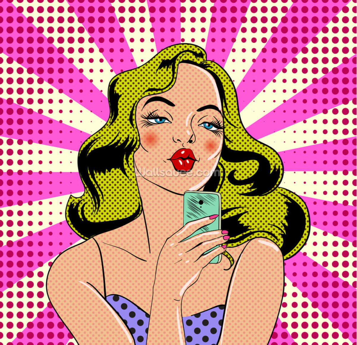 For a glam and beautiful pop art wallpaper, choose this retro Selfie Pout wallpaper! A modern take on classic pop art, this retro wallpaper of a pretty young woman holding her phone will make a stunning feature wall.