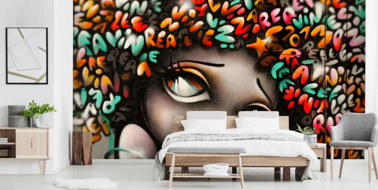 Make a bold artistic statement with the Word Head Graffiti wallpaper mural. This striking street art design features a powerful portrait of a woman whose hair is made up entirely of layered graffiti-style words, blending portraiture with urban expression.