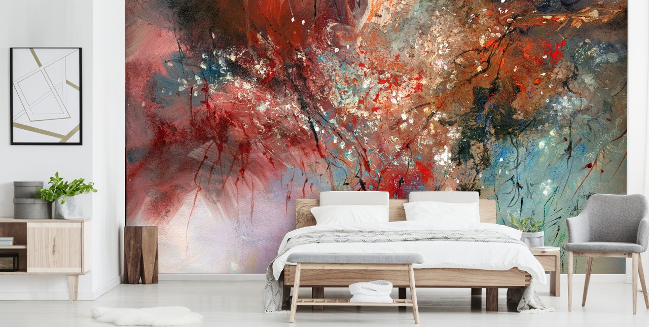 Wir finden, dass diese Gemäldetapete in einem geselligen Raum wie einem Wohn- oder Esszimmer wunderbar aussehen würde, da die Farben jedem Raum Energie verleihen. Kombinieren Sie sie mit neutral gestrichenen Wänden und Möbeln mit roten Ornamenten hier und da.