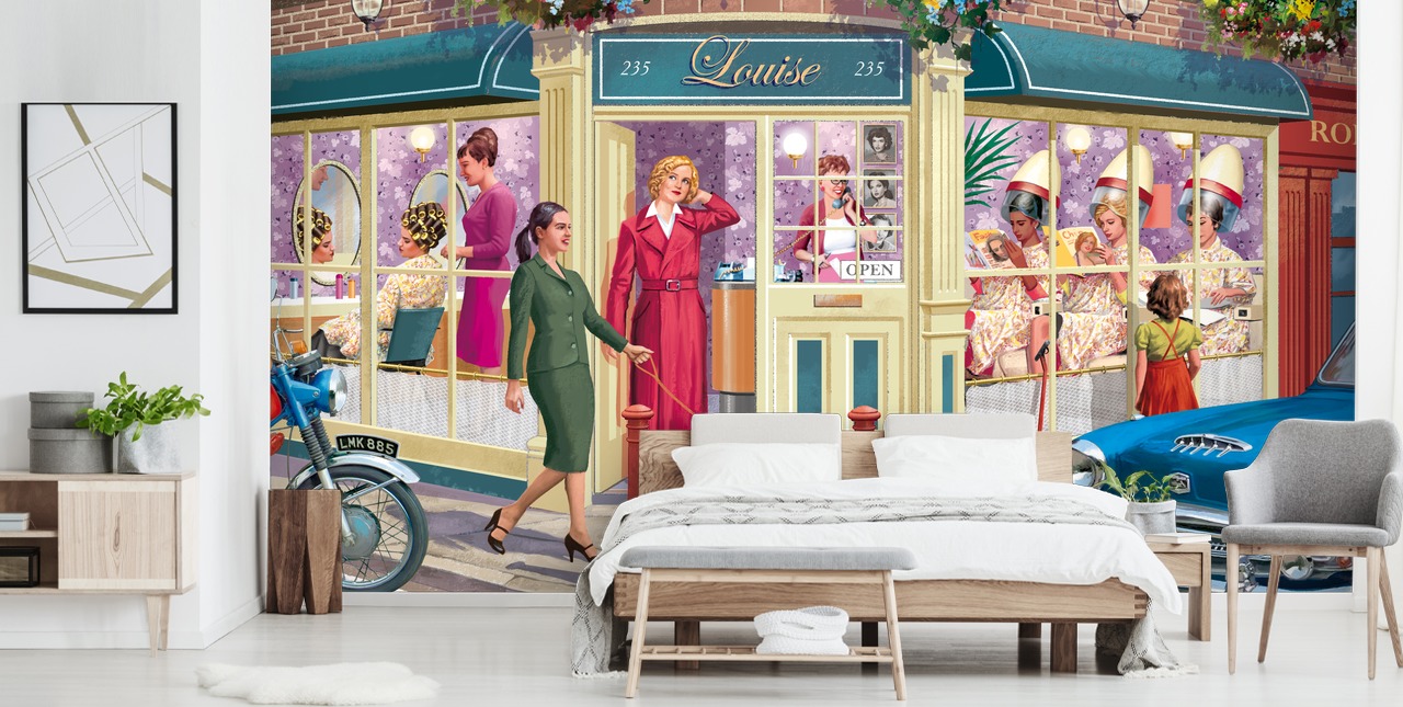 Machen Sie mit Corner Hairdressers, einer Wandtapete für Pflegeheime des Künstlers Victor McLindon, einen Schritt zurück in einen Friseur aus vergangenen Zeiten.