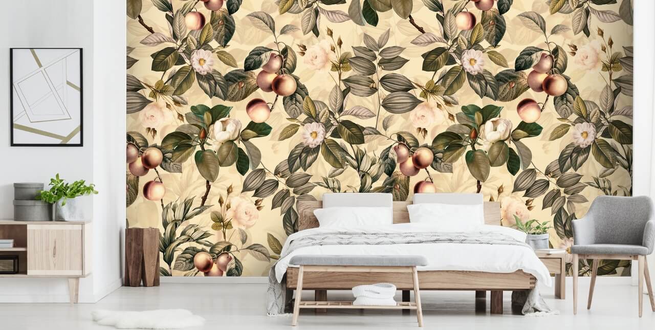 Lieben Sie hübsche Blumentapeten? Dann wählen Sie dieses maßgefertigte Tapeten-Wandbild Exotischer Sommertag aus unserer Uta Naumann Blumentapetenkollektion. Dieses neutrale Obst- und Blumenwandbild ist perfekt für ein von der Natur inspiriertes Schlafzimmer.