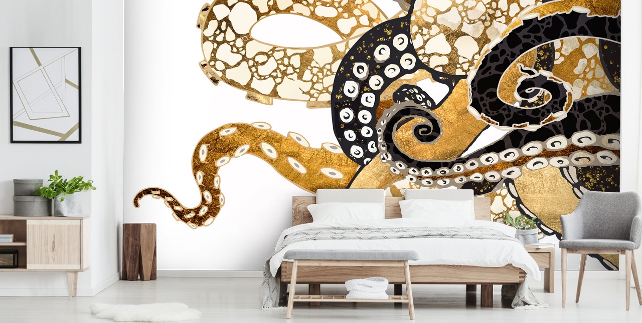 Mit wunderschönen goldenen Farben im Kontrast zu Schwarz- und Brauntönen ist diese wunderschöne Glam Octopus-Tapete sicherlich eine Wahl für alle, die einen luxuriösen Hingucker in ihrem Zuhause suchen!
