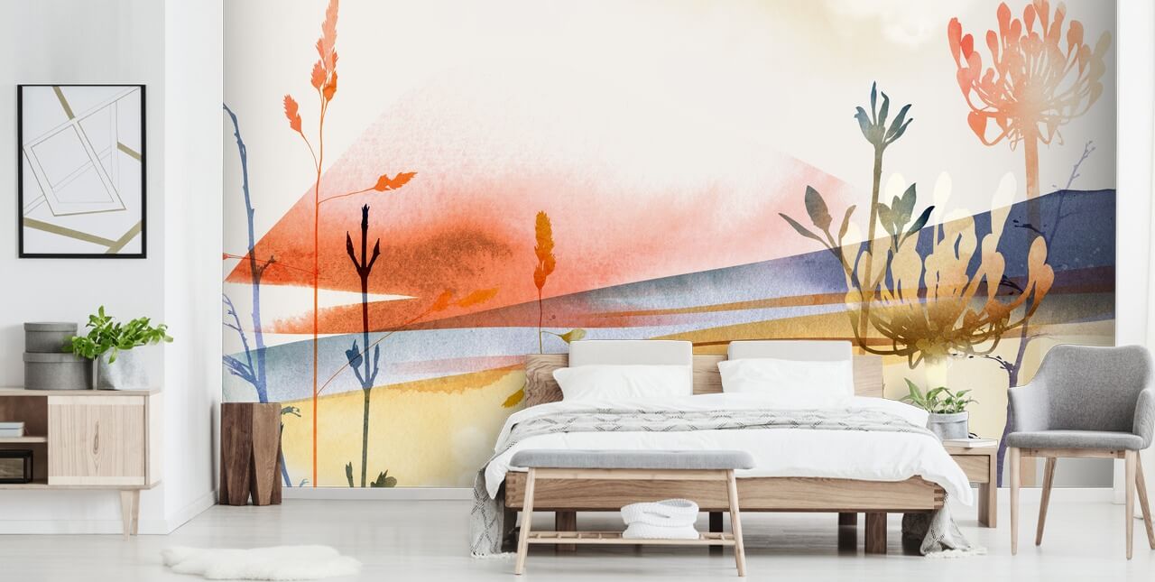 Die herbstlichen Orangen und Ockergelbtöne bei dieser Aquarelltapete sollten mit einer Mischung aus Raum-Accessoires in ähnlichen Tönen wie orangen Streukissen und einem Teppich sowie gelbgoldenen Raum-Accessoires wie einer Lampe oder Türgriffen akzentuiert werden. Die Bestellung dieser abstrakten Strandtapete ist einfach.