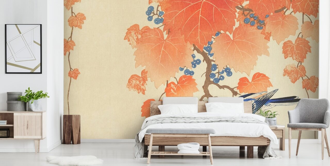 Wir glauben, dass dieses antike Gemälde von Ohara Koson eine atemberaubende Wand in einem Schlafzimmer über einem Bett bilden würde, sodass es so aussieht, als würden die Blätter nachts über Ihrem Kopf hängen. Integrieren Sie Blau- und Orangetöne in den Raum mit Raumaccessoires wie Kissen, Vasen, Vorhängen, Teppichen und sogar einem Sessel. Holen Sie sich noch heute Ihre, indem Sie das Formular auf dieser Seite ausfüllen.