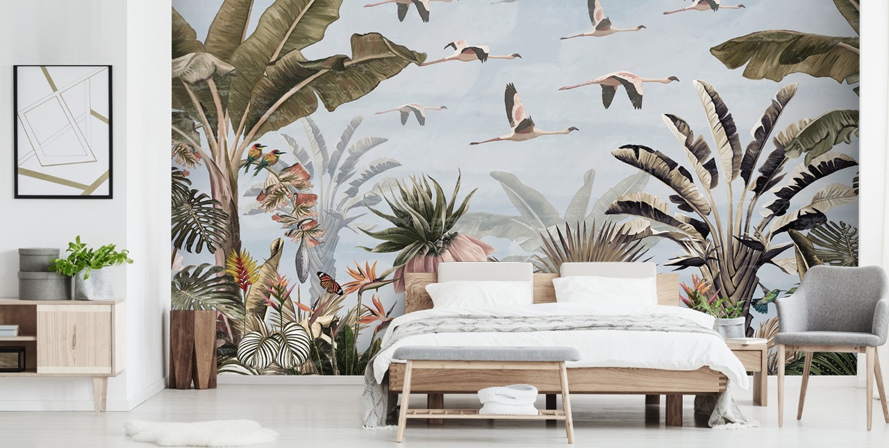 Erwecken Sie den Dschungel in Ihrem Zuhause oder Geschäft zum Leben mit diesem geschäftigen und schönen Jungle Flamingo Flamboyance Blue Tapeten-Wandbild.