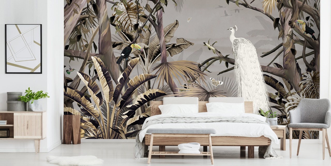 Verwandeln Sie eine schlichte Wand in etwas Spektakuläres mit diesem wunderschönen, fesselnden Wandbild „Jungle White Peacock“ in Wallsauce.