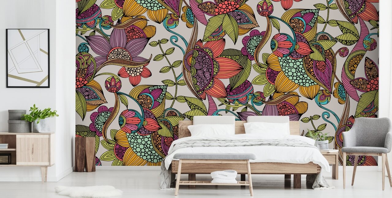 Da diese wunderschöne Blumentapete in Farbe und Muster schwelgt, sollten Sie versuchen, den Rest der Raumeinrichtung so minimalistisch wie möglich zu halten. Das heißt aber nicht, alle Farben zu vermeiden. Wenn Sie eine Farbe aus dem Design wählen und einen Stuhl, einen Tisch oder Vorhänge in diesem Farbton finden, wird die atemberaubende Kritzeltapete zum Platzen gebracht und die Farben des Designs können durch den Raum fließen.