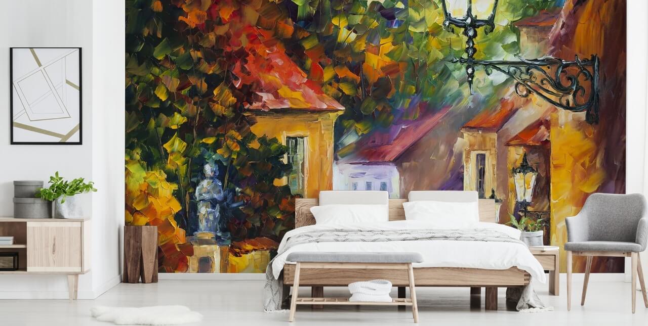 Die schönen Pinselstriche aus bunter Farbe wurden vom berühmten Leonid Afremov gemalt und verwandeln jeden Raum. Warum verwenden Sie es nicht als Küchentapete und sorgen Sie für ein mediterranes Flair im Raum? Kombinieren Sie es mit magnolienbemalten Wänden und Küchenschränken aus Naturholz. Wählen Sie Terrakottatöpfe zum Aufbewahren von Utensilien.