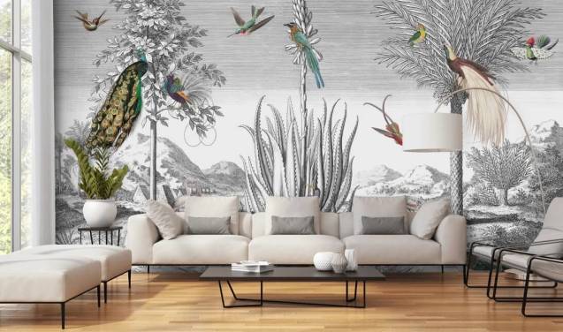 Schwarz-Weiß-Hintergrund mit bunten Vogel-Tapete