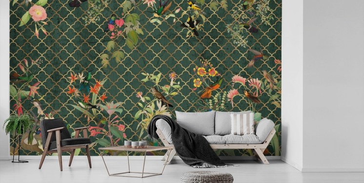 Vögel auf dunkelgrün gemusterten Hintergrund-Tapete