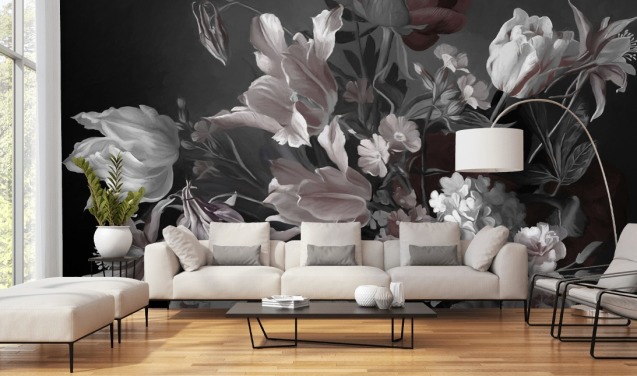 Tulpen-Tapetentapete im Vintage-Stil mit dem Titel Antique Tulips von Marina Stupakova für Schlafzimmer und Wohnzimmer