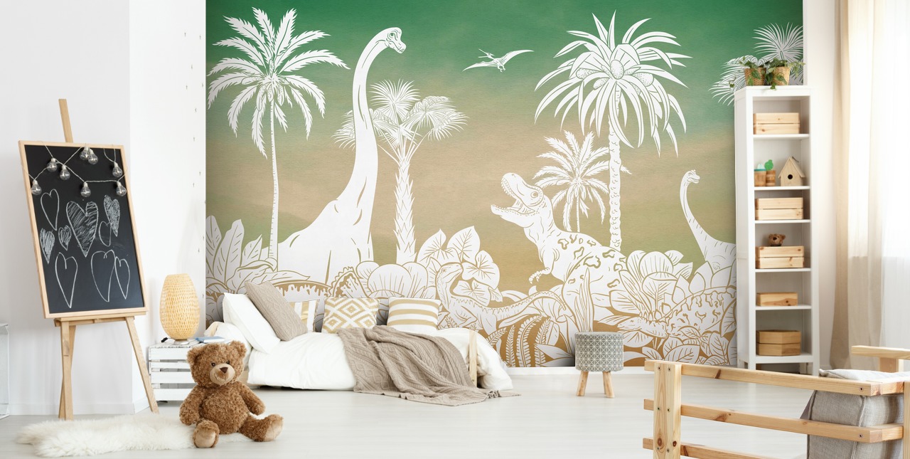 Liebt Ihr Kind alles, was mit Dinosauriern zu tun hat? Sie werden die Monochrome Dino - Green Sky-Tapete in ihrem Schlafzimmer oder Spielzimmer lieben!