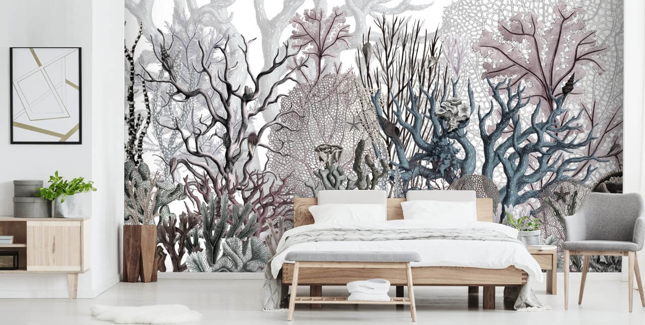Diese antike Korallen-Illustration wurde im Vintage-Stil entworfen und mit modernen Farbtönen kombiniert und bildet eine fantastische, stilvolle Wand in jedem Raum Ihres Hauses. Schwelgen Sie in den lila Tönen, indem Sie die umgebenden Wände im gleichen Farbton streichen, oder werden Sie dunkel und mutig mit den umgebenden marineblau gestrichenen Wänden. Sie haben die Wahl.