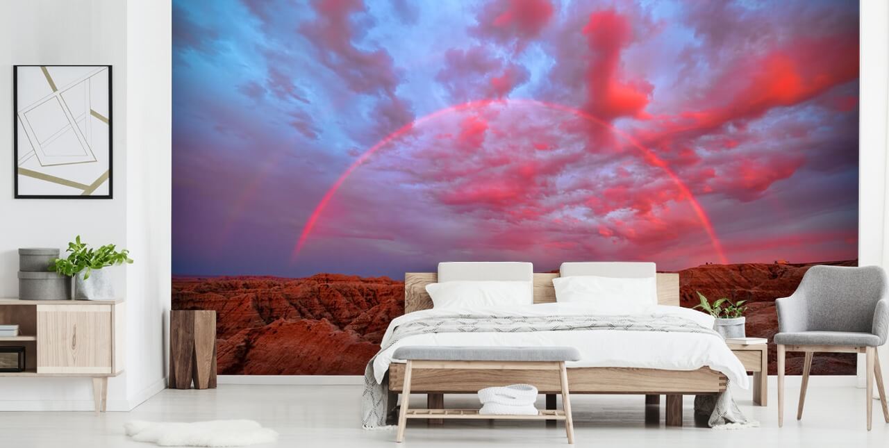 Wenn Sie eine auffällige Wand in Ihrem Zuhause schaffen möchten, wählen Sie dieses maßgeschneiderte Tapeten-Wandbild Pink Arch über Badlands. Diese atemberaubende rosa Regenbogentapete würde an der Wand hinter einem Bett fantastisch aussehen, sodass sie als Verlängerung des Kopfteils dient.