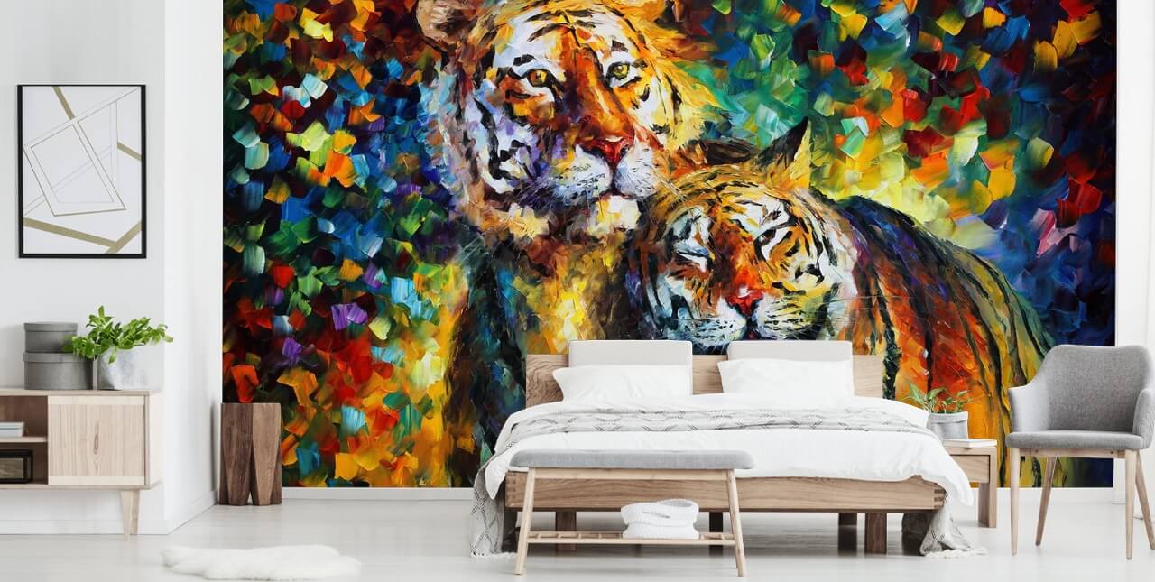Mit wunderschönen Orangen, Rot, Blau und vielem mehr würde diese faszinierende und farbenfrohe Tiger-Tapete in jedem Raum fabelhaft aussehen. Aufgrund der Niedlichkeit und Intimität der Tiger empfehlen wir, sie in einem Hauptschlafzimmer zu verwenden, das sich hinter dem Kopfteil des Bettes befindet.