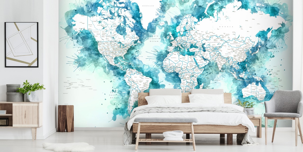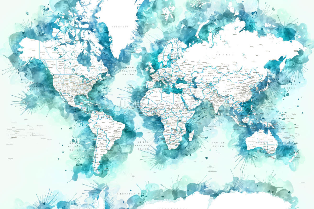 Für ein verträumtes und künstlerisches Weltkarten-Wandbild wählen Sie dieses wunderschöne blaugrüne Aquarell-Wandbild, das von der fabelhaften Rosana Laiz Garcia entworfen wurde.