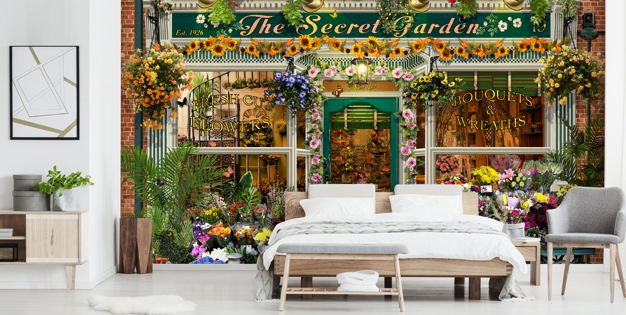 The Secret Garden ist ein spektakuläres Fassadentapetengemälde des Illustrators Garry Walton, das vor Farbe und Charme strotzt.