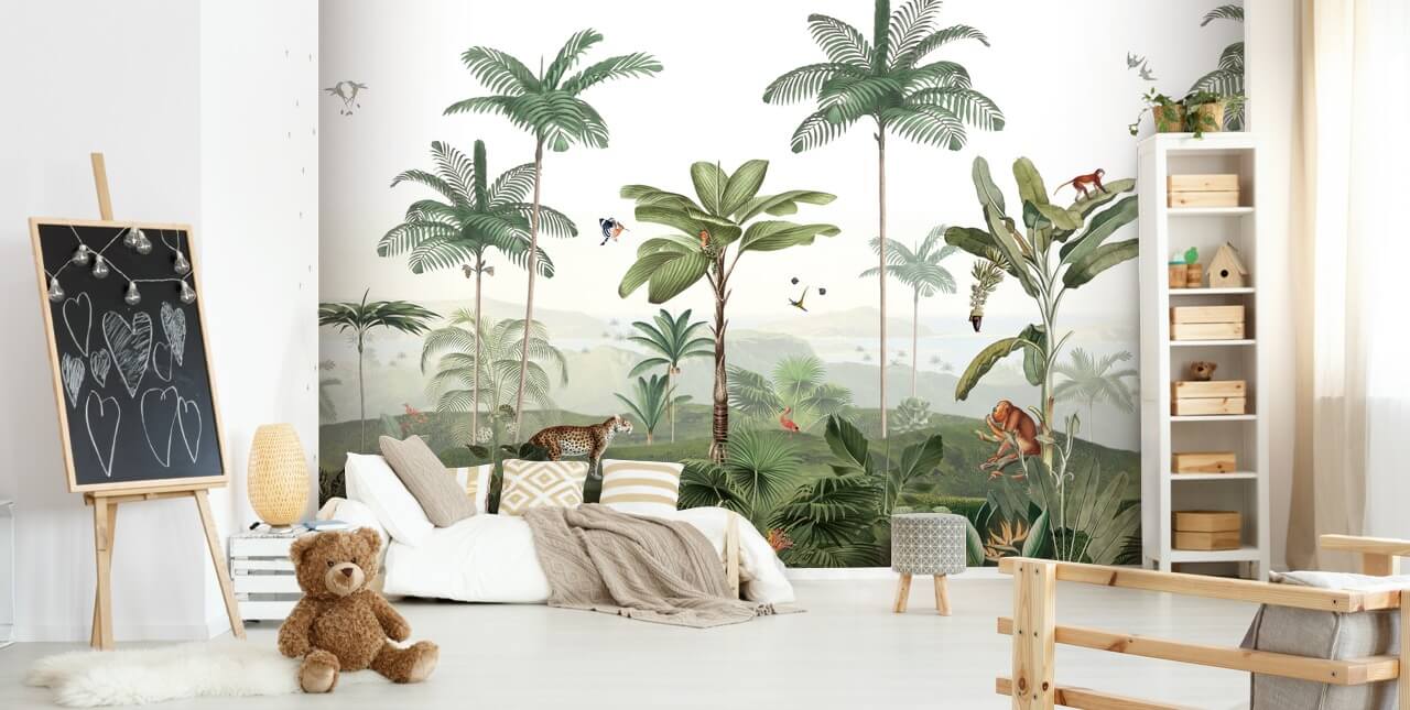 Wenn Sie ein Dschungelmotiv im Schlafzimmer oder Kinderzimmer Ihres Kindes haben möchten, dann wählen Sie dieses maßgeschneiderte Tapeten-Wandbild Thrilling Tropics von Wallsauce.com!