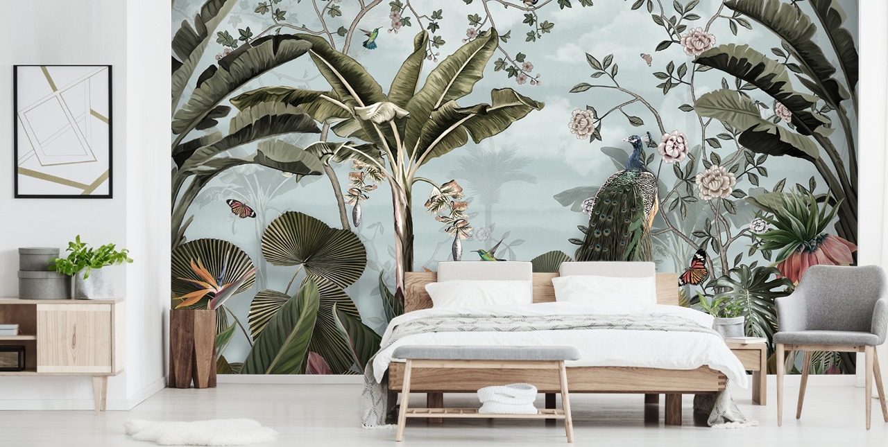 Das Wandbild Tropical Forest Peacock Sky Blue ist Teil unserer Wilderness-Kollektion und hat ein lebendiges Design, das eine schlichte Wand in etwas Spektakuläres verwandelt!