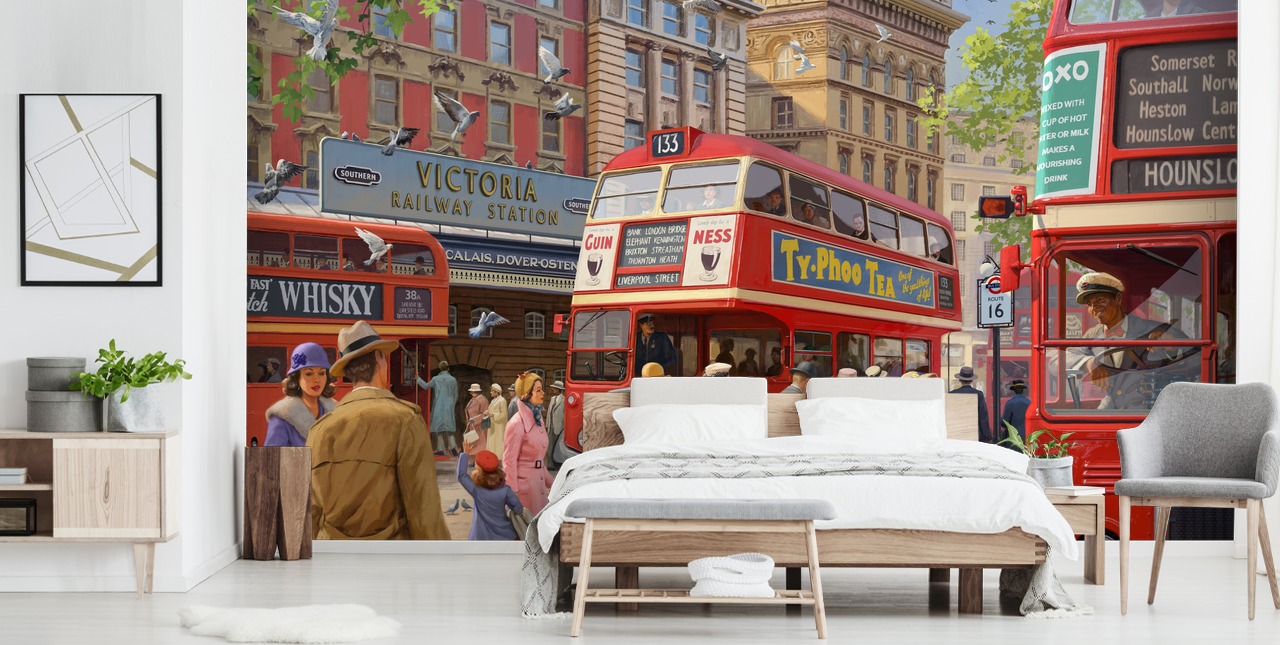 Machen Sie eine Zeitreise mit dem Wandbild Victoria Station, das die Hektik Londons perfekt einfängt. Diese lebendige Szene erweckt einen sonnigen Tag voller elegant gekleideter Menschen, die auf ihren Bus warten, zum Leben und zeigt den Charme und Stil einer vergangenen Zeit.