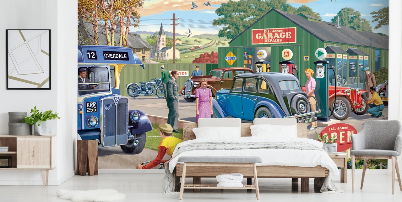 Es ist Zeit, in der Vintage Garage, einer farbenfrohen Pflegeheimpapete, die vom Künstler Victor McLindon entworfen wurde, zu tanken.