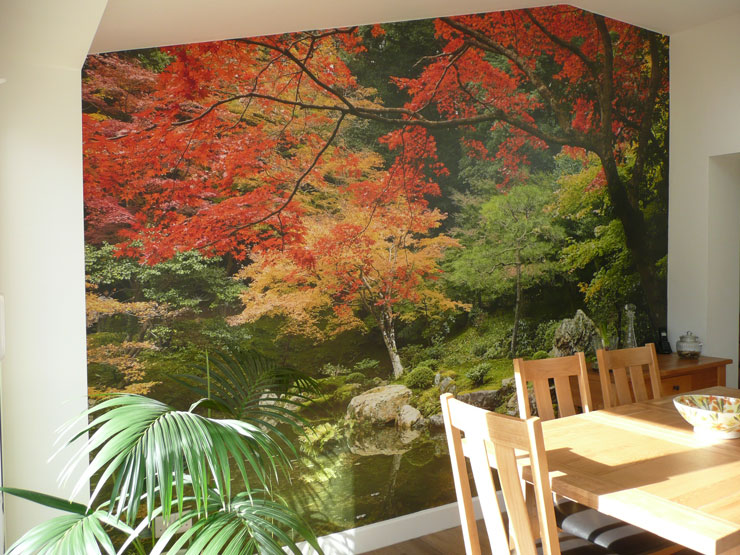 Küchen und Essbereiche sind großartige Orte, um diese Illusion zu schaffen und den Außenbereich ins Haus zu holen. Diese Räume befinden sich in der Regel im hinteren Teil des Hauses und liegen vor dem Garten, sodass sie sich hervorragend für eine Fototapete eignen, die den Garten ins Haus holt. Wie atemberaubend ist diese Herbst-Waldfarben-Wandmalerei im Esszimmer unseres Kunden Bill? Neben der Anbringung dieser wunderschönen japanischen Gartentapete ist auch der Einrichtungsstil sehr natürlich. Der natürliche Holztisch und die Stühle sowie die grüne Pflanze harmonieren perfekt mit der orientalischen Gartentapete.