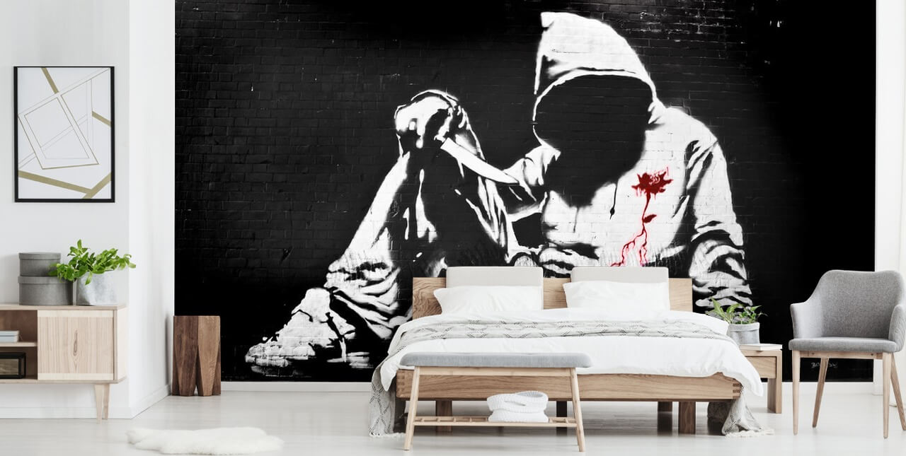 Wenn Sie Street Art lieben, werden Sie diesen epischen Banksy Hoodie mit Knife Graffiti-Tapete lieben. Maßgeschneidert, um perfekt an Ihre Wand zu passen.