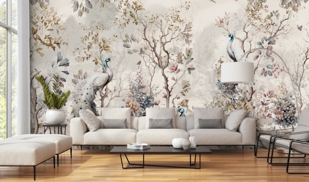 Tapeten-Wandbild im Chinoiserie-Stil mit blauen und weißen Pfauen