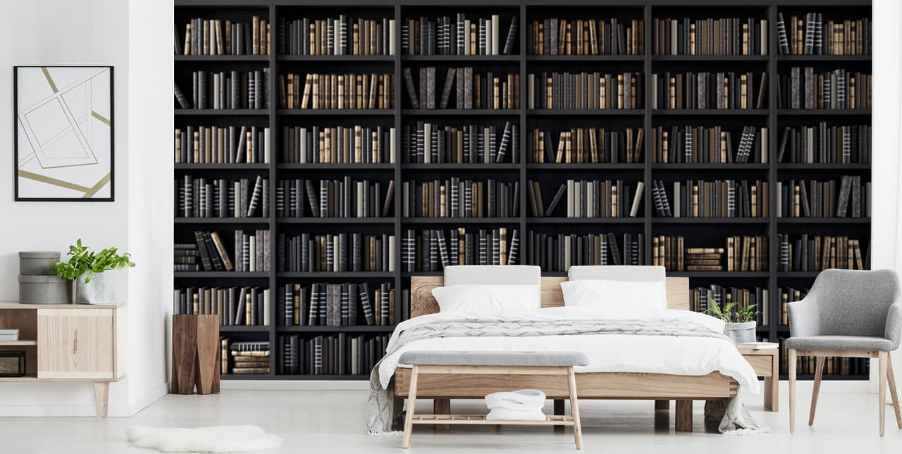Genießen Sie dieses maßgeschneiderte schwarze Bücherregal-Tapeten-Wandbild.