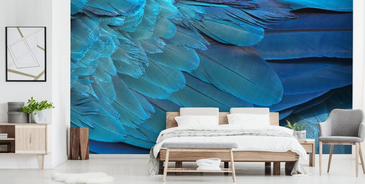 Genießen Sie diese Blue Ara-Federdruck-Tapete bequem von zu Hause aus. Die wunderschönen Saphirtöne der wunderschön geschichteten Federn verleihen Ihrem Zuhause ein luxuriöses Gefühl.