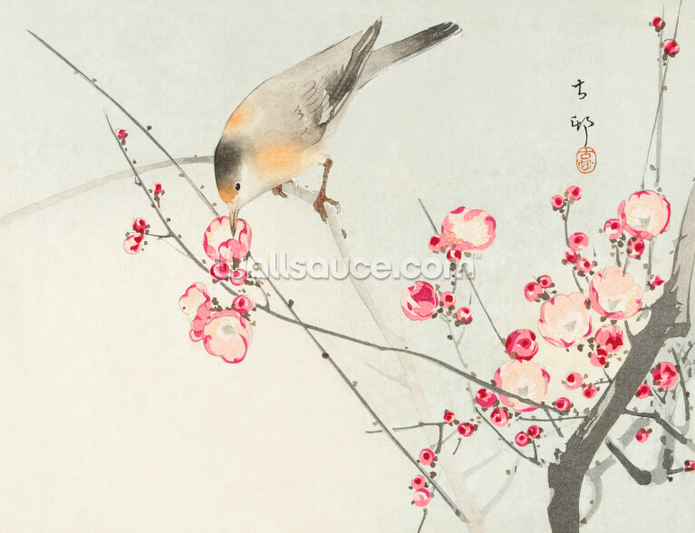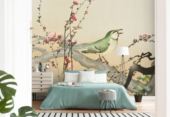 orientalische Vogelmalerei auf Kirschblüten-Tapete