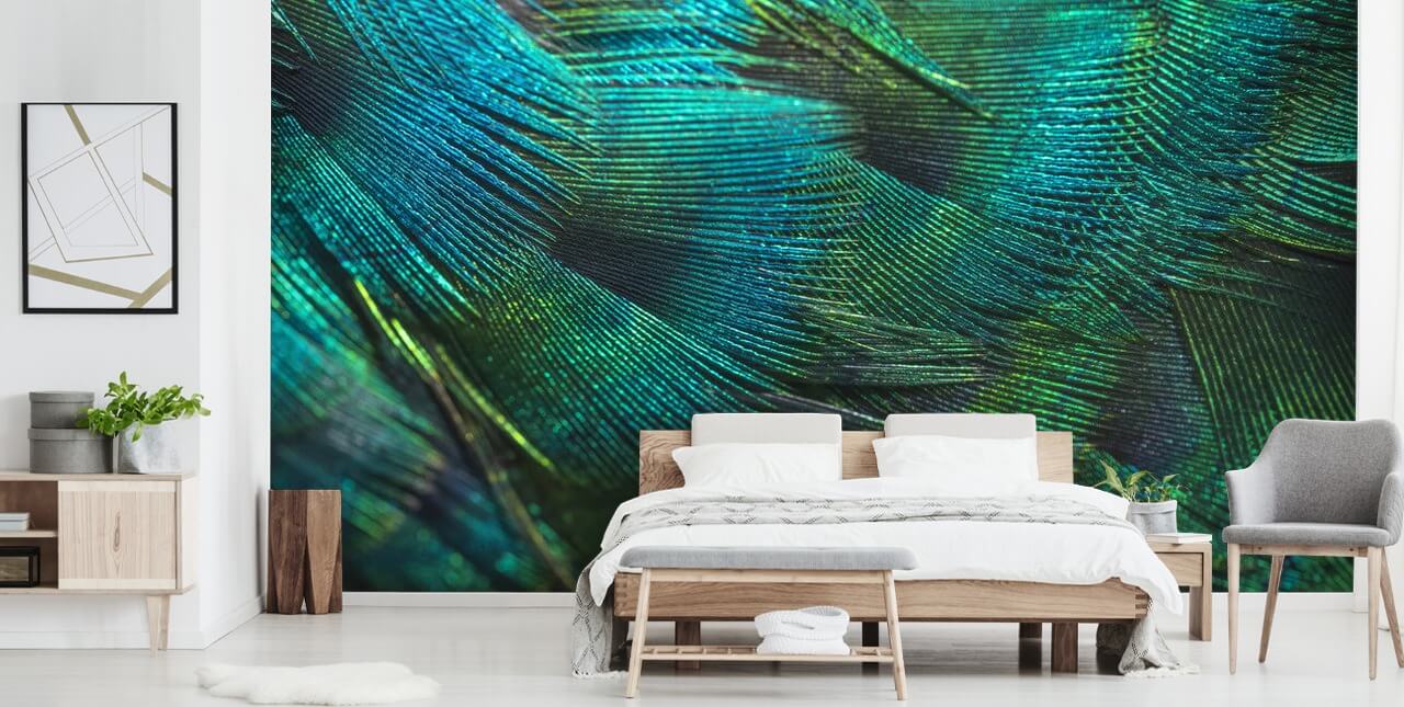 Kommen Sie der Natur hautnah mit unserem maßgeschneiderten Nahaufnahme Pfauenfedern Wandbild.