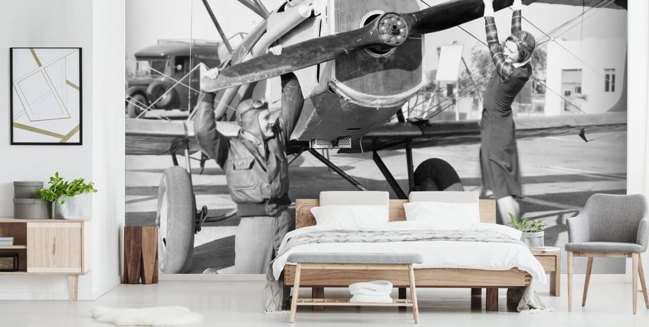 Genießen Sie dieses atemberaubende Paar, das mit einem Propeller in einem Flugzeug-Wandbild spielt. Maßgefertigt und in Paneelen für ein DIY-freundliches Erlebnis geliefert.