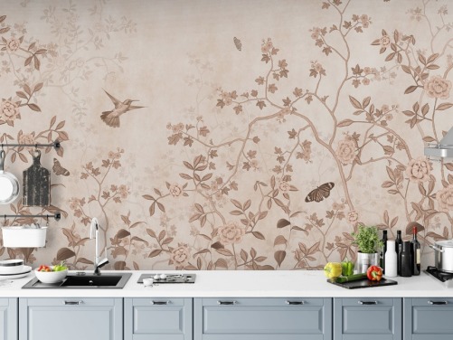 beigefarbenes Dschungel-Wandbild mit dem Titel Beige Birds and Butterflies at Wallsauce für Schlafzimmer, Badezimmer und Flure