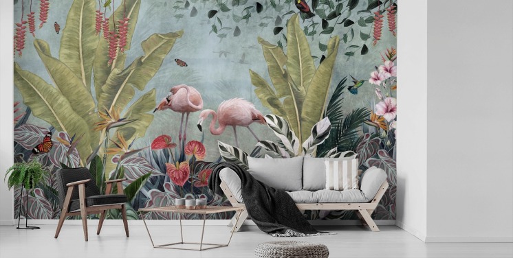 rosafarbenes Blumentapetenwandbild mit Vögel für Schlafzimmer