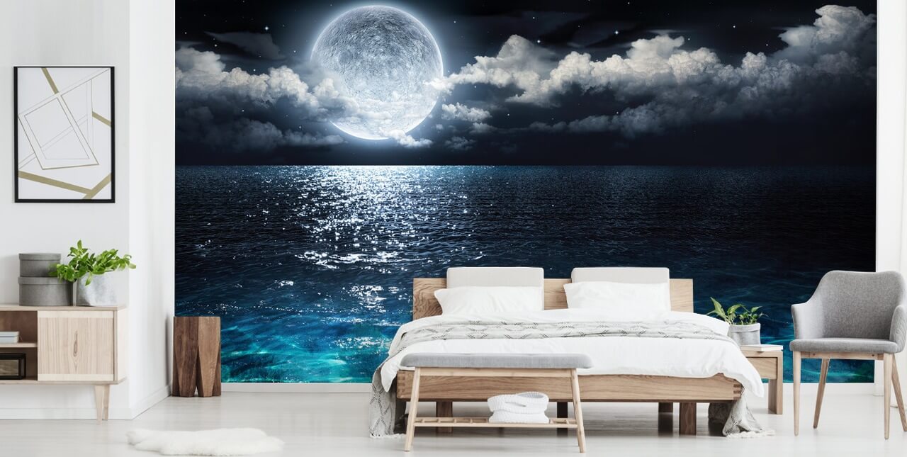 Holen Sie sich dieses wunderschöne Glowing Ocean Moon Wandbild in Ihr Zuhause. Maßgeschneidert für die Abmessungen Ihrer Wand.