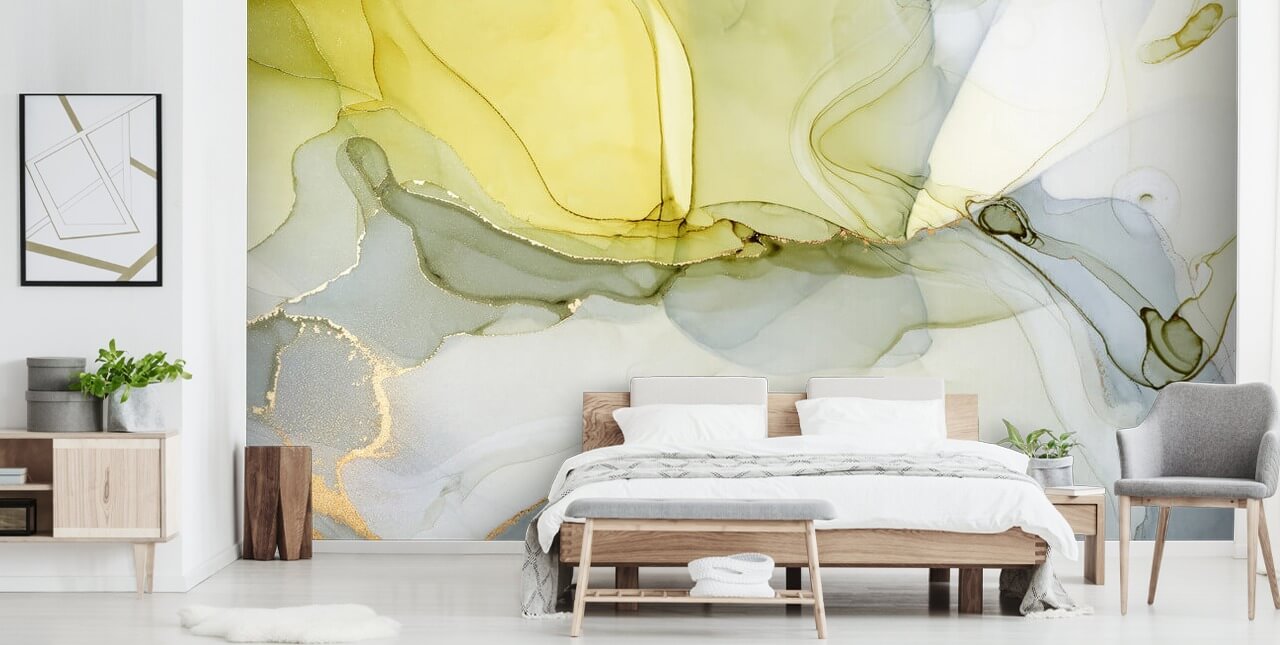 Seien Sie bereit für eine fantastische Feature-Wand mit unserem Aquarellgemälde in Grau und Senf, das für Ihre Wand maßgeschneidert ist.