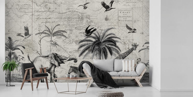 Beige und natürlich getönte Vintage-Karte und Palmen-Tapete