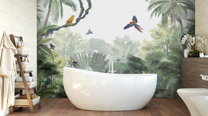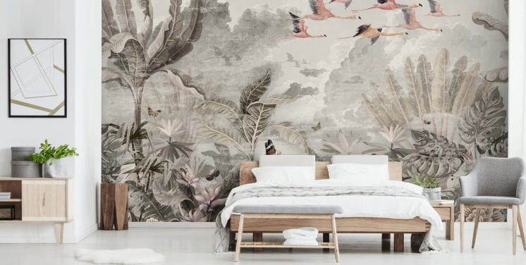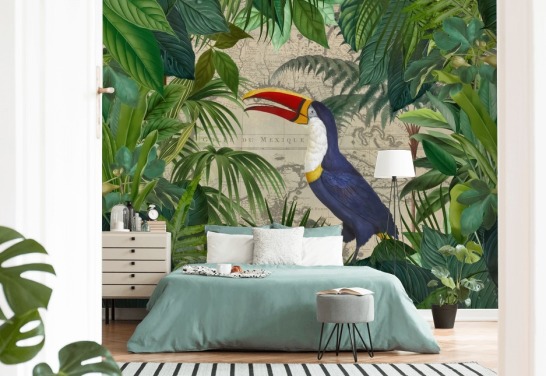 Dschungel-Tapete mit dem Titel Parrot Flying Through the Jungle at Wallsauce für Schlafzimmer und Wohnzimmer