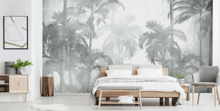 dunkle Palmentapete namens Palm Trees and Butterflies Dark at Wallsauce für Schlafzimmer