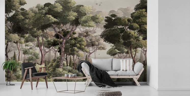 Gedämpfte grüne Dschungelbäume und Sträucher, umrahmt von einer weißen Hintergrundtapete
