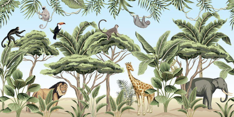 Buntes personalisierbares Cartoon-Tapetentapete mit dem Titel Tiere im Dschungel für das Kinderzimmer