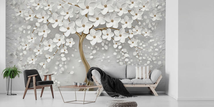 Personalisierbare Blumentapete in Weiß und Gold namens Monochrome Blossom für Schlafzimmer