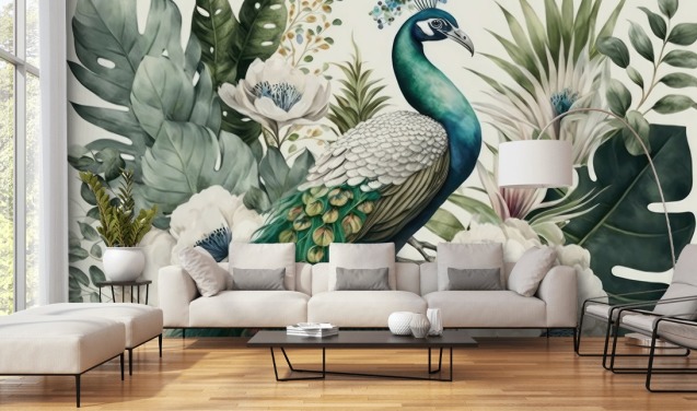 Transform your space with a beautiful peacock wallpaper mural. Peacocks represent beauty, renewal, and confidence. Their stunning look adds elegance to any room, whether a bedroom, living room or home office.