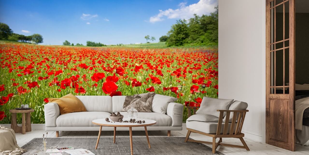 Stunning Poppy field wall mural from Wallsauce. This high quality Poppy field wallpaper is custom made to your dimensions. Easy to order and install .