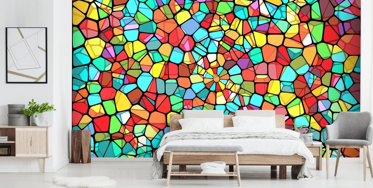 Dieses farbenfrohe Buntglasfenster ist perfekt für alle Altersgruppen und sieht im Kinderzimmer Ihres Kindes fantastisch aus. Installieren Sie dieses Wandbild hinter dem Bett oder entlang der längsten Wand in ihrem Schlafzimmer und streichen Sie die restlichen Wände mit weißer Farbe. Wählen Sie eine Reihe weißer Möbel, aber fügen Sie kleine Farbtupfer hinzu, um die Regenbogenfarbauswahl der Wandmalerei mit Glasmalerei widerzuspiegeln.